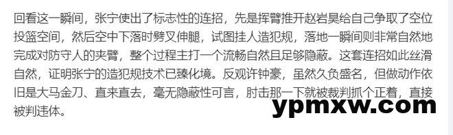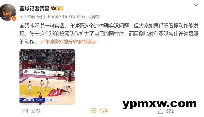 不妨再来看看篮球记者贾磊的评价,贾队长认为:许钟豪的违体没问题,但如果仔细看慢动作能发现,张宁这个球的投篮动作也扩大了自己的圆柱体,而且倒地的时候双腿勾住了许钟豪。