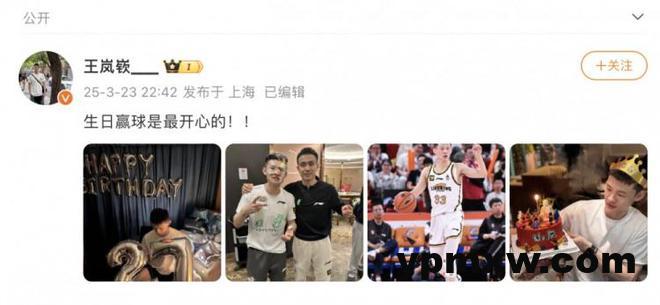 直播吧3月23日讯 今日,CBA常规赛,辽宁客场111-110险胜上海。赛后,辽宁球员王岚嵚更新社媒晒照庆祝生日夜赢球。