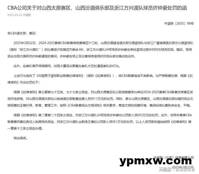该来的总是要来的。昨晚深夜22点,CBA官方发布公告,开出了包括许钟豪、王博、山西男篮俱乐部,以及山西赛区在內的15万重磅罚单。对山西男篮与广厦队比赛中出现的系列不文明现象,进行了严厉处罚。