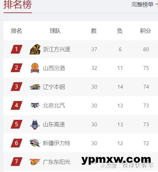 卫冕冠军辽宁队,在经过前阵子的低迷后,最近他们的状态不错,随着赵继伟和张镇麟回暖,他们连战连捷。这一场客场险胜上海队以后,球队也拿到赛季第30胜,成为本赛季第6支达到这一成就的球队。目前,他们的战绩是30胜14负,排在积分榜第3位。北京队则以30胜13负,排在积分榜第4名。山东队则紧随其后,以30胜13负,排在积分榜第5名。积分榜第6则是新疆队,他们的战绩是30胜12负,只能屈居第6名。