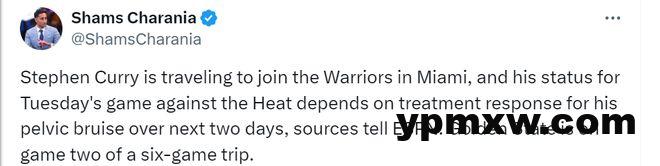 两天前,勇士队官方宣布,库里接受了核磁共振检查,结果证实这位控球后卫骨盆挫伤,但无结构性损伤。对于勇士,这真是不幸中的万幸。他没有随队飞往亚特兰大,并缺席了对老鹰的比赛。但现在已经前往迈阿密去和勇士会合。
