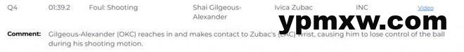 比赛最后1:39,快船落后99-100落后1分,亚历山大(雷霆)伸手接触到祖巴茨(快船)的手腕,导致他在投篮动作中失去对球的控制