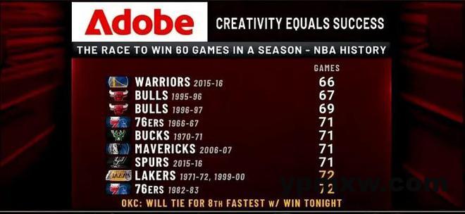 据统计,雷霆仅用72场比赛就取得60场胜利,追平NBA历史第八快,详情如下: