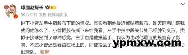 “说下小曾左手中指胶布下面的情况。其实看到他最近都贴着胶布,昨天踩场训练我就问他怎么了,小曾把胶布撕下来给我看,左手中指中段关节处已经肿到变形,类似于接球挫到了那种感觉。左手也是他投篮手,我认为也对他最近的投篮有了影响。不过小曾还是要留在场上的,即使投丢了几个球,他也能在篮板和防守上帮助到球队。”