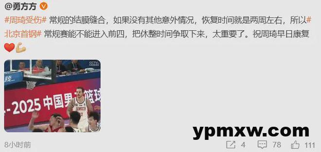 好在周琦的恢复时间不会太长,仅需两周左右即可,如果北京队能杀进四强,属于他们的季后赛征程开打前应该就能等到前者回归。