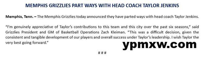 北京时间3月29日,灰熊官方宣布,与主教练詹金斯分道扬镳。