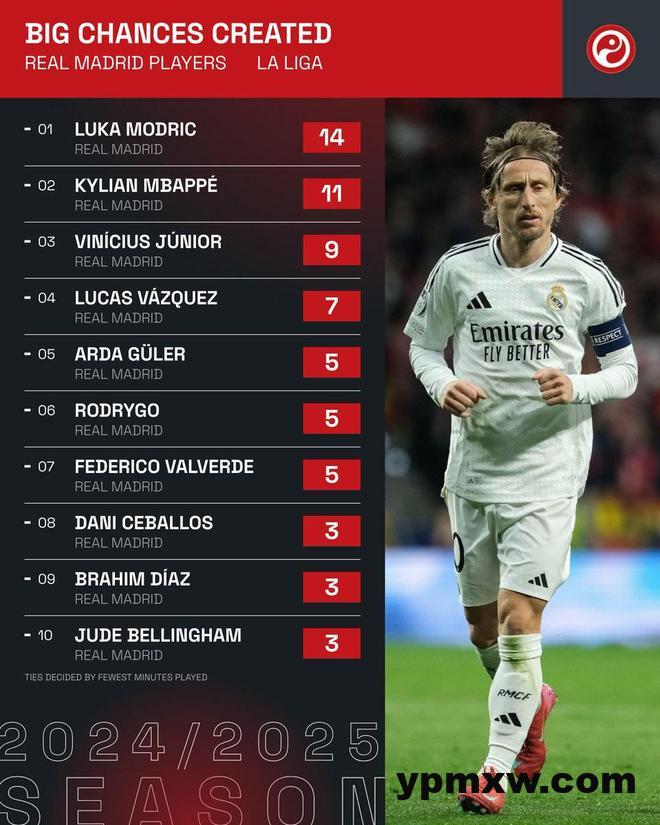 尽管本赛季西甲只有11次首发,但39岁的莫德里奇是本赛季西甲创造绝佳机会次数最多的皇马球员。