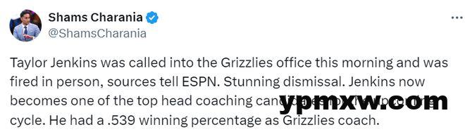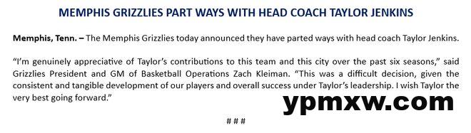 灰熊队总经理扎克-克莱曼在一份声明中表示:“我由衷感谢泰勒(詹金斯)在过去六个赛季中为这支球队以及这座城市所做出的贡献。这是一个艰难的决定,毕竟在泰勒的带领下,我们的球员取得了持续且显著的进步,球队也取得了整体上的成功。我祝愿泰勒在未来一切顺利。”