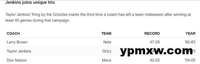 詹金斯还是NBA历史上第三位在当赛季至少赢得40场比赛的情况下,赛季中途被解雇的主教练。灰熊目前的战绩是44胜29负,另外两位是1982-83赛季的篮网主帅拉里-布朗(被解雇时球队47胜29负)、2004-05赛季的独行侠主帅老尼尔森(被解雇时球队42胜22负)。