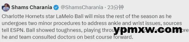全明星后卫三球将接受脚踝和手腕两个手术,本赛季剩余比赛全部报销,迄今为止这哥们出战了黄蜂72场比赛中的47场,场均砍下25.2分4.9板7.4助,包括单场狂轰过50分10助超级大号两双。