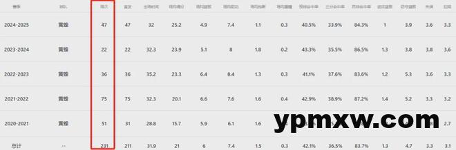 出道五个赛季里,三球总共就打了231场常规赛,平均每个赛季出战46场,至于季后赛嘛,还没有打过一场。