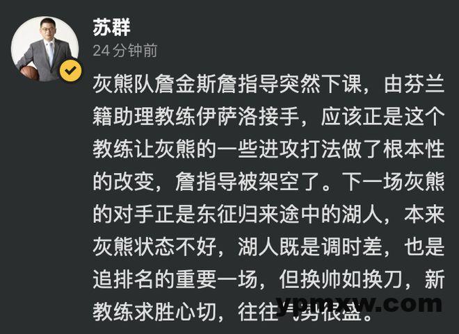 “灰熊队詹金斯詹指导突然下课,由芬兰籍助理教练伊萨洛接手,应该正是这个教练让灰熊的一些进攻打法做了根本性的改变,詹指导被架空了。下一场灰熊的对手正是东征归来途中的湖人,本来灰熊状态不好,湖人既是调时差,也是追排名的重要一场,但换帅如换刀,新教练求胜心切,往往气势很盛。 ”苏群写道。