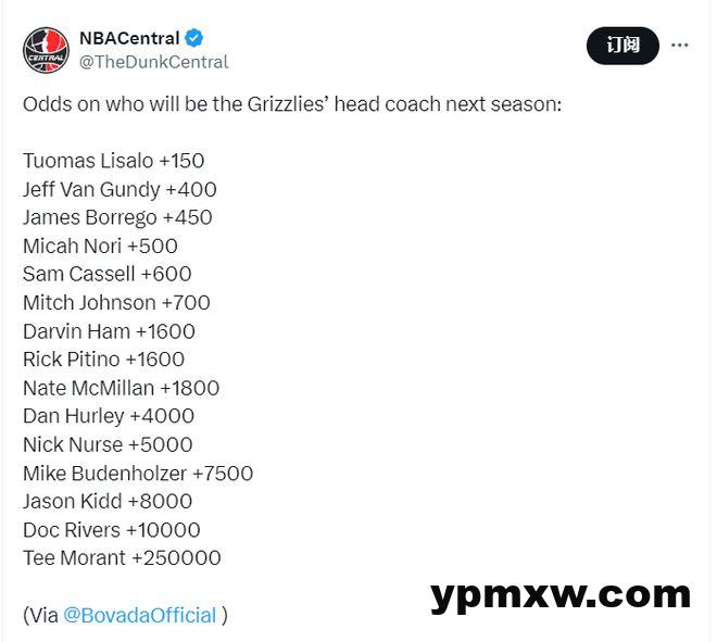 灰熊下一任正式主帅的也已经出炉,目前的临时主帅伊萨洛+150排名第一,位居第2的是小范甘迪+400,随后依次是博雷戈、迈卡-诺里、萨姆-卡塞尔、米奇-约翰逊、哈姆、里克-皮蒂诺、内特-麦克米兰、丹-赫尔利、纳斯、布登霍尔泽、基德、里弗斯、蒂-莫兰特(莫兰特的父亲)。