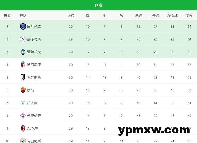 目前,国际米兰以64分继续继续领跑积分榜,那不勒斯则以61分排名第二,紧随其后的是亚特兰大,他们以58分位列第三,博洛尼亚凭借本轮的胜利,积分达到56分,牢牢占据第四的位置。而终结连败的尤文图斯以55分排名第五,依然有机会竞争欧冠资格。罗马则凭借7连胜的势头,总积分达到52分,上升至第六,继续向前四发起冲击。