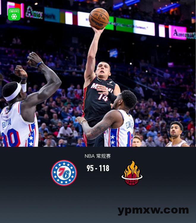 第四节76人贾斯汀-爱德华兹拿下9分,热火希罗拿下8分,最终76人95-118不敌热火
