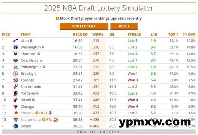 不过,如果从另一个方面看,76人无缘附加赛也不算坏事,目前他们的战绩联盟第5差,将很有机会保住自己今年的首轮签。如果以倒数第5的排名结束赛季,76人有42.1%的概率抽中前四,最差是第9。如果常规赛最后阶段还能继续降低自己的排名,他们还能增加保住自己今年首轮的概率。