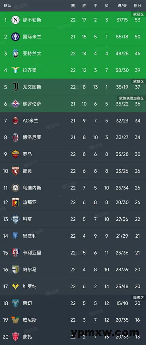 意甲最新积分榜