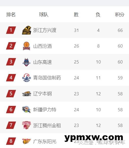 目前CBA积分榜上,广厦以31胜4负的战绩,笑傲全联盟,稳居积分榜第一位。山西队紧随其后,排在积分榜第2,这两支球队早已提前锁定季后赛。积分榜第三的山东队,他们的战绩是25胜10负,也提前锁定季后赛。青岛队和新疆队,他们也都至少拿到24胜以上,这五支球队都领先积分榜第13的胜场超过12场,在常规赛还剩下11轮的情况下,他们已经稳进季后赛了。