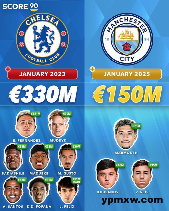 1.切尔西:2023年冬窗花费3.3亿欧,签下恩佐、穆德里克、巴迪亚西勒、马杜埃凯、古斯托、桑托斯、福法纳、菲利克斯