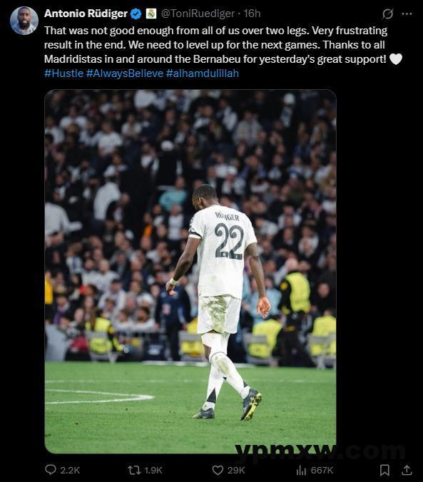 吕迪格在个人社媒写道:“两回合比赛我们所有人都表现得不够好。最终的结果非常令人沮丧。我们需要在接下来的比赛中更上一层楼。感谢伯纳乌球场内外所有马德里球迷昨天的大力支持!”
