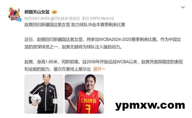 目前,农历新年还没有过完,CBA联赛还在休赛期中,但是WCBA联赛要开打了,新疆女篮也是官宣了一些签约,除了引进两个新的外援,就是正式签下了前中国女篮国手赵爽。