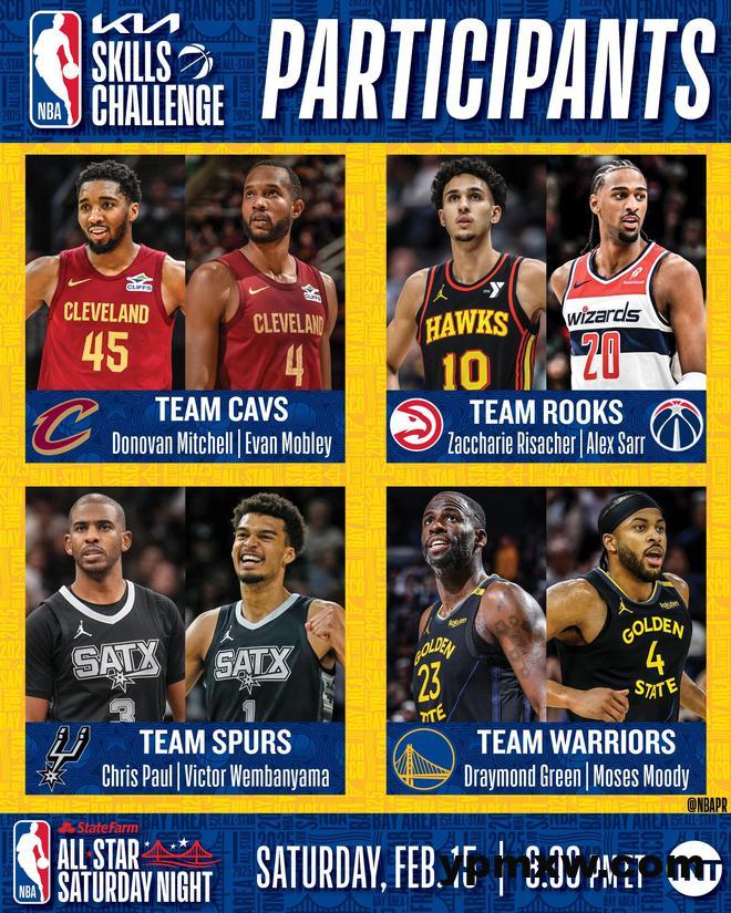 北京时间2月8日,NBA官方公布了2025旧金山全明星技巧挑战赛的完整名单。参赛者包括米切尔+莫布利(骑士队)、里萨谢+萨尔(新秀队)、保罗+文班亚马(马刺队)、追梦+穆迪(勇士队)。