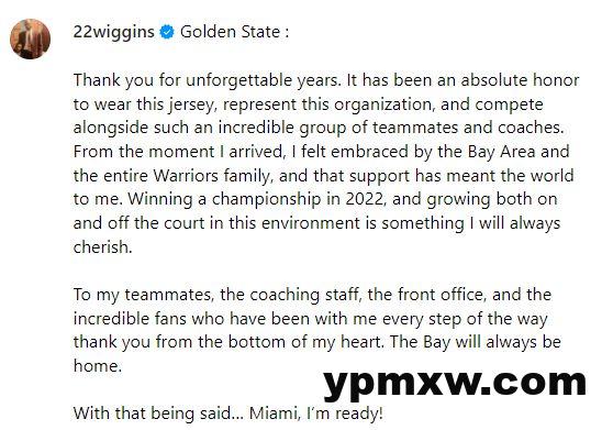 对于我的队友、教练组、管理层以及一路陪伴我的出色球迷,我衷心感谢你们。湾区永远是我的家。话虽如此……迈阿密,我准备好了!