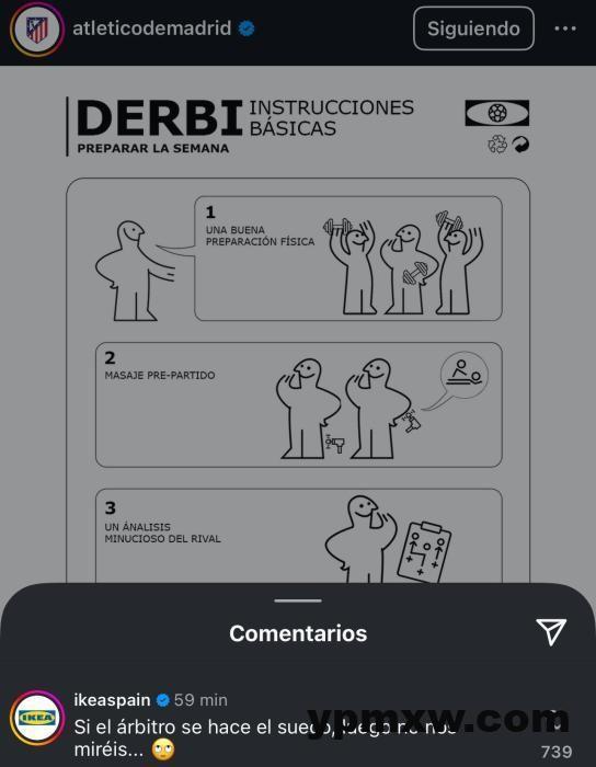 马竞在社交媒体上发布了一份模仿宜家家具安装说明书的”德比赛前准备基本说明”,其中包含四个步骤:体能准备、赛前按摩、分析对手,以及讽刺皇马“使用官方电视台对裁判施压”。