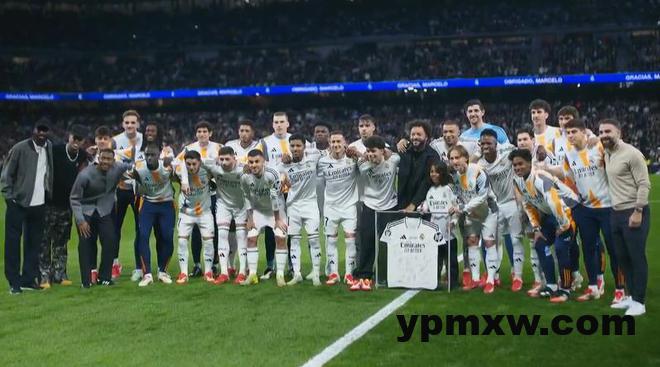 莫德里奇为马塞洛送上纪念球衣,皇马全队和现场球迷为他送上掌声。