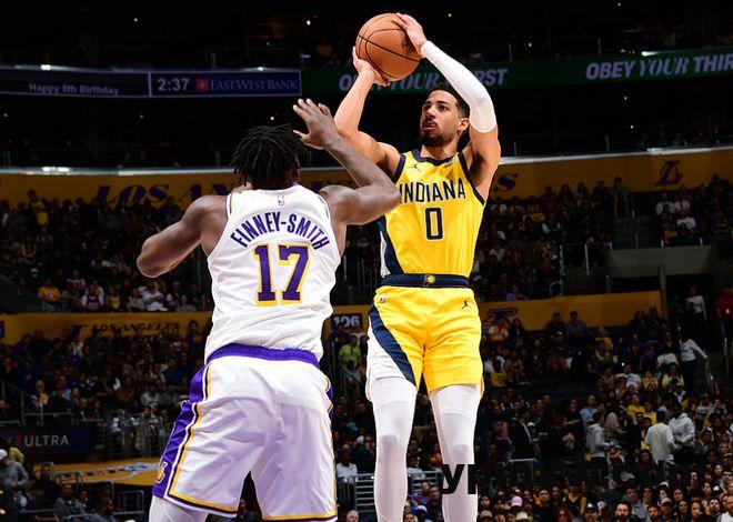末节开局,布莱恩特率先暴扣与沃克两罚全中,里夫斯连续两记三分回敬,古德温中投得分。哈利伯顿三分追分,湖人一波9-2攻势扩大18分优势,其中里夫斯一度抢断暴扣。步行者连追5分,海斯空接暴扣,西亚卡姆上篮命中,海斯手臂出血进行治疗。托平三分命中,里夫斯上篮与古德温三分扩大13分优势,西亚卡姆2+1追分,哈利伯顿三分与西亚卡姆暴扣追到差5分。双方接连三分不中,八村塁空接得分,哈利伯顿暴扣追分,里夫斯被犯规两罚全中奠定胜局,最终湖人战胜步行者收获5连胜。