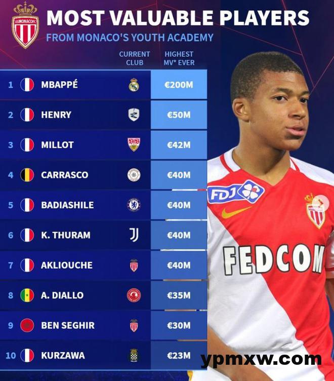 直播吧2月13日讯 《转会市场》统计了摩纳哥青训出身球员历史身价最贵榜单,姆巴佩无悬念领跑。