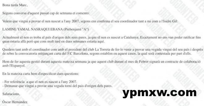 直播吧2月14日讯 近日,在一档采访中,一位前巴萨青训幼儿组的协调员披露了一份2015年的邮件。彼时,7岁的亚马尔所在的母队即将与西班牙人合作,这位协调员果断发送了邮件建议拉玛西亚试训。