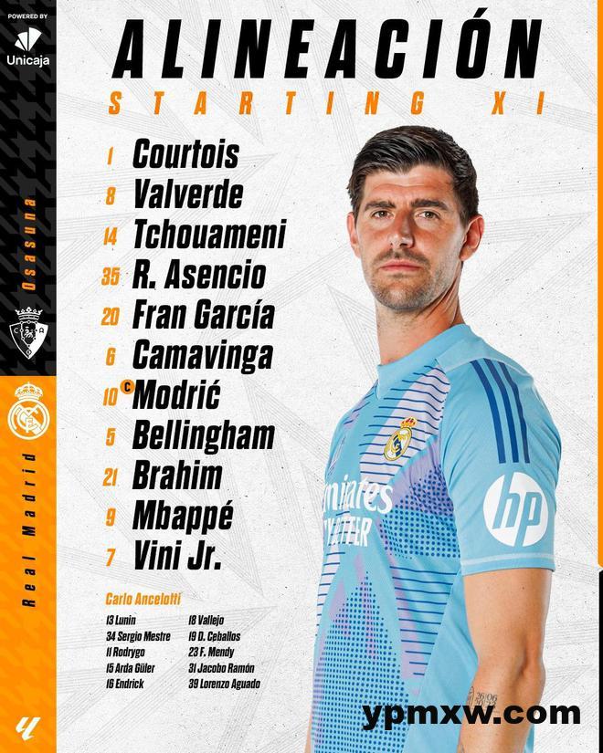 皇马首发:1-库尔图瓦、8-巴尔韦德、14-琼阿梅尼、35-劳尔-阿森西奥、20-弗兰-加西亚、6-卡马文加、10-莫德里奇、5-贝林厄姆、21-迪亚斯、9-姆巴佩、7-维尼修斯