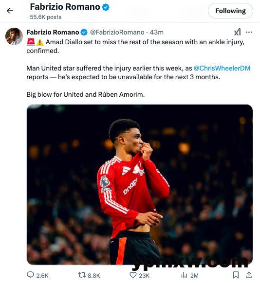 北京时间2月16日凌晨,著名记者罗马诺确认,阿玛德·迪亚洛赛季报销。罗马诺透露,阿玛德遭遇的是脚踝韧带的伤病,将至少缺席接下来3个月的比赛,这对阿莫林来说,是重大的打击。
