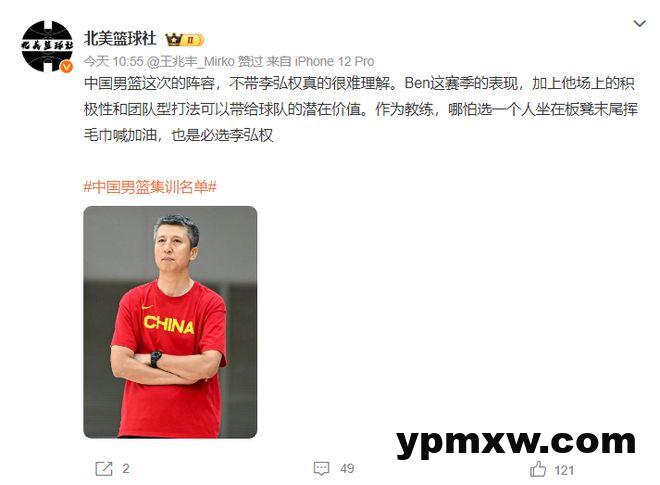 北美篮球社:中国男篮这次的阵容,不带李弘权真的很难理解。李弘权的积极性和团队型打球可以为球队带来潜在价值。作为教练,哪怕选一个坐板凳末喊加油也是必选李弘权。