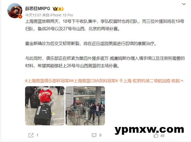 上海记者薛思佳报道:上海男篮放假两天,18年球队会汇合,李弘权会归队。