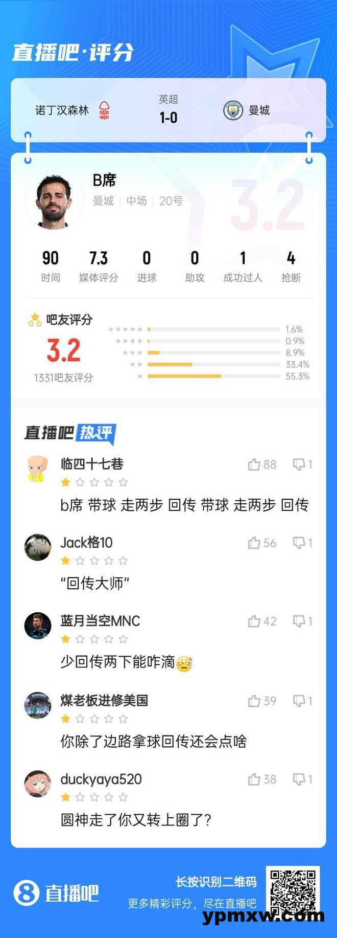 直播吧03月09日讯 本轮英超曼城0-1不敌诺丁汉森林,本场曼城中场B席首发出战并打满全场,2射0正9次丢失球权。