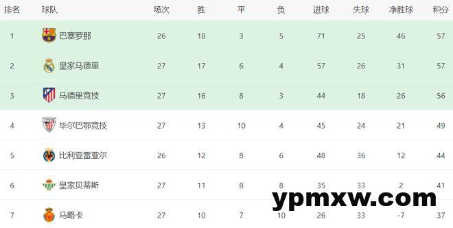 在积分榜上,巴萨以57分依然排名榜首。皇马赢球之后,追上来了,也是57分,以净胜球的劣势排名第2。马竞输球,依然是56分,排名第3。毕尔巴鄂竞技49分排名第4。比利亚雷亚尔44分,排名第5。第6名的是皇家贝蒂斯,拿到41分。