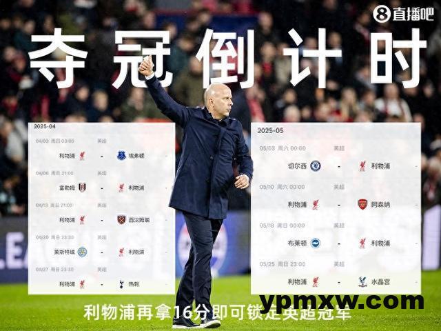 利物浦如果剩余比赛完成六连胜,他们在对阵切尔西时即可锁定冠军,第36轮主场可轻松迎战阿森纳。阿森纳联赛已三场不胜,如果继续丢分,可能让利物浦的夺冠更早到来。