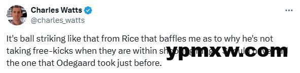 在赖斯进球后,阿森纳系的记者Charles Watts在社媒表示:“赖斯这样的射门让我困惑了,为什么获得射程范围以内的任意球时不让他去主罚呢?之前厄德高主罚的那个任意球应该让他去踢。”