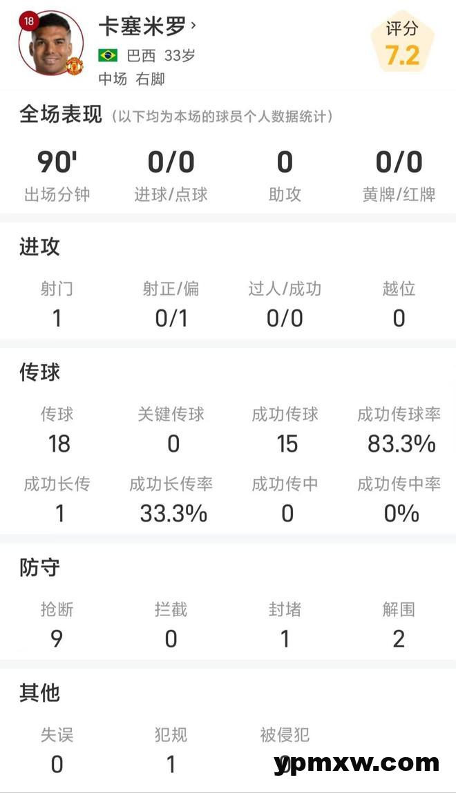 根据赛后统计数据显示,卡塞米罗本场比赛10次抢断9次成功,这也是本赛季英超联赛单场比赛的记录。