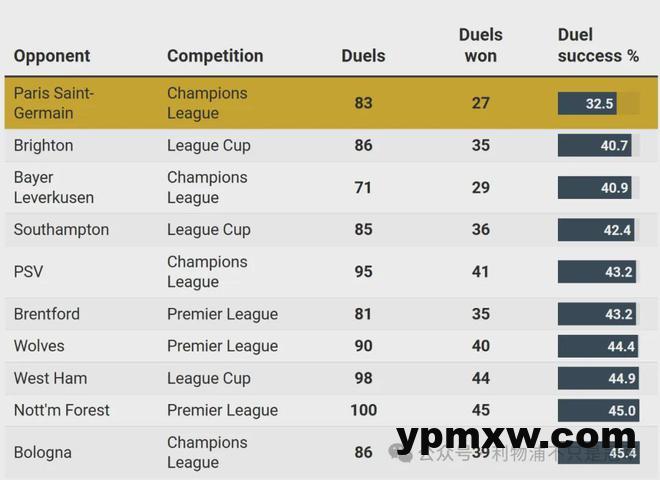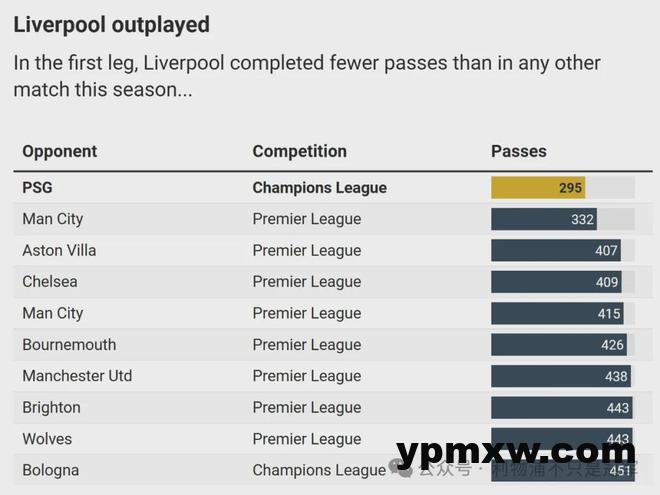 以下两张图表显示,利物浦首回合对巴黎的比赛,无论是传球成功率还是对抗成功率,都是本赛季最差的一场比赛。