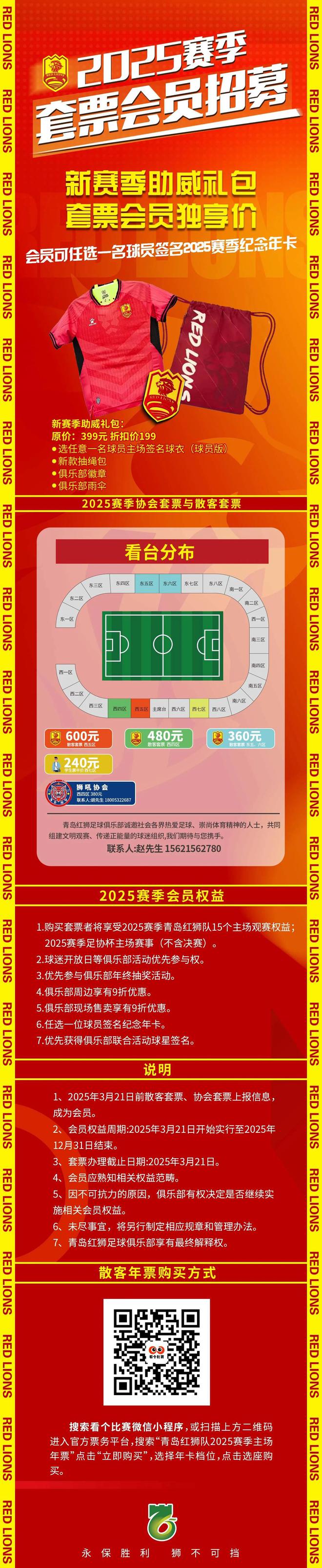 1.购买套票者将享受2025赛季青岛红狮队15个主场观赛权益;2025赛季足协杯主场赛事(不含决赛)。