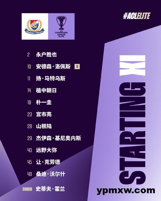 横滨水手方面,主教练史蒂夫·霍兰安排安德森·洛佩斯等5外援首发,上一场表现活跃,并且攻入唯一进球的洛佩斯,还担任场上队长。朴一圭司职门将。