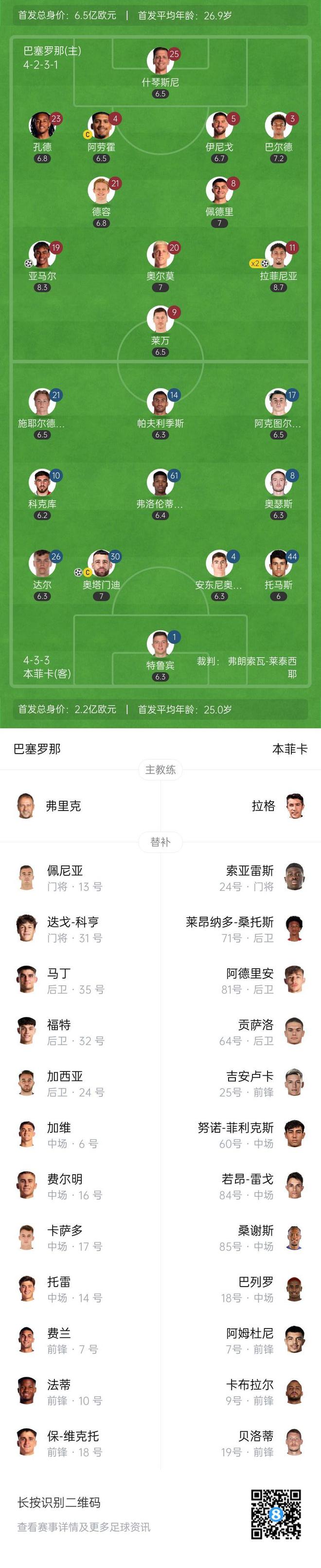 直播吧3月12日讯 北京时间1:45,欧冠1/8决赛次回合巴塞罗那主场迎战本菲卡,首回合巴萨1-0占得先机。比赛在奥林匹克球场打响!上半场,亚马尔助攻拉菲尼亚破门;奥塔门迪很快扳平;随后亚马尔左脚禁区外兜射破门!巴尔德反击助攻拉菲尼亚完成双响!半场结束,巴萨暂3-1领先本菲卡,总比分4-1!