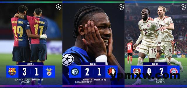 至此,24-25赛季欧冠1/8决赛的前4场较量战罢,巴塞罗那3-1击败本菲卡、国际米兰2-1战胜费耶诺德、勒沃库森0-2不敌拜仁慕尼黑。