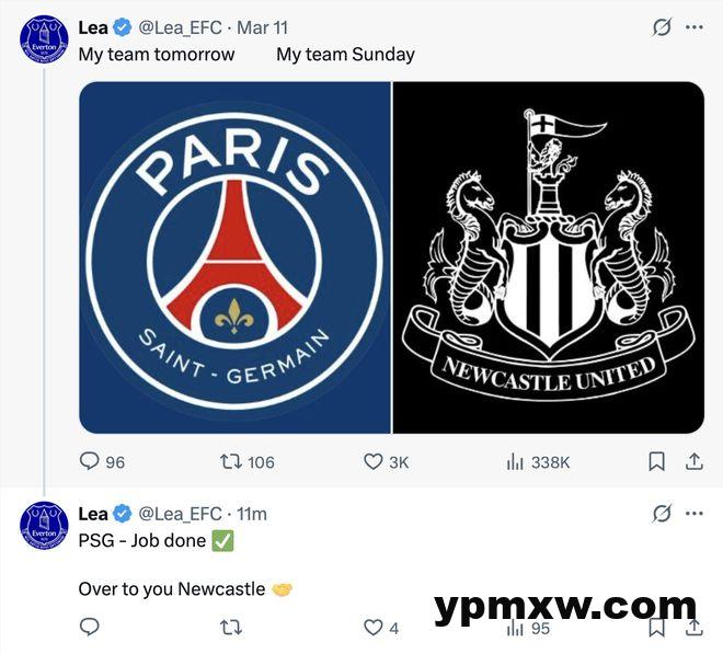 赛后国外知名埃弗顿球迷账号陷入狂欢,“今天我的主队是巴黎圣日耳曼,周日我的主队就是纽卡斯尔联。”