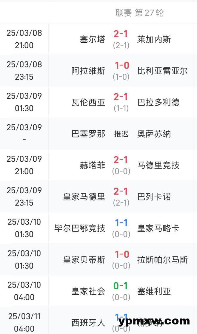 雷速体育3月12日讯 西甲第27轮全部结束,本轮9场比赛,有7场分出胜负,而决出胜负的比赛,赢球一方均是一球小胜。
