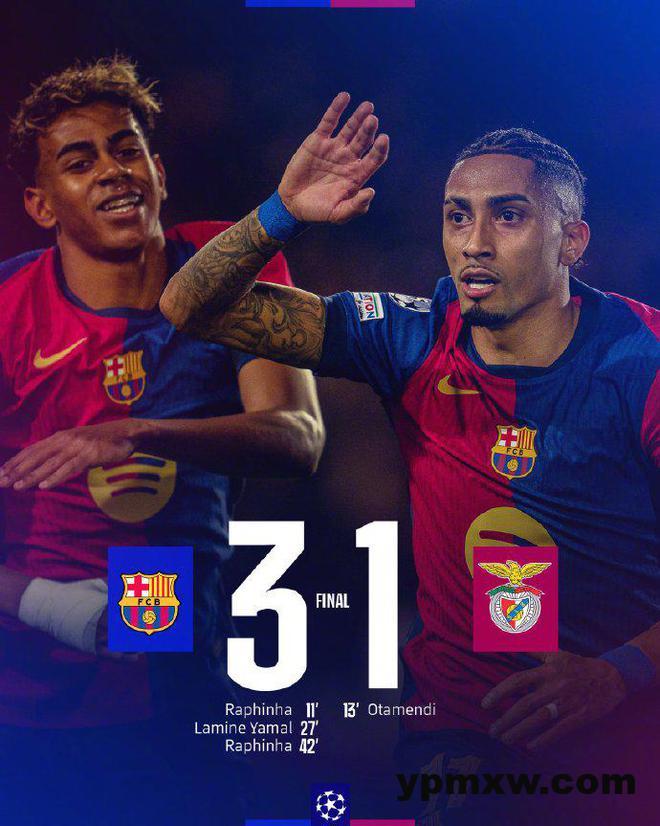 第 11 分钟巴萨迎来梦幻开局。亚马尔在禁区前沿展现出超凡的个人能力,扣球动作一气呵成,直接晃倒防守球员,随后精准地将球传到后点,拉菲尼亚及时跟进,轻松推射破门。巴萨 1-0 领先本菲卡,总比分来到 2-0。