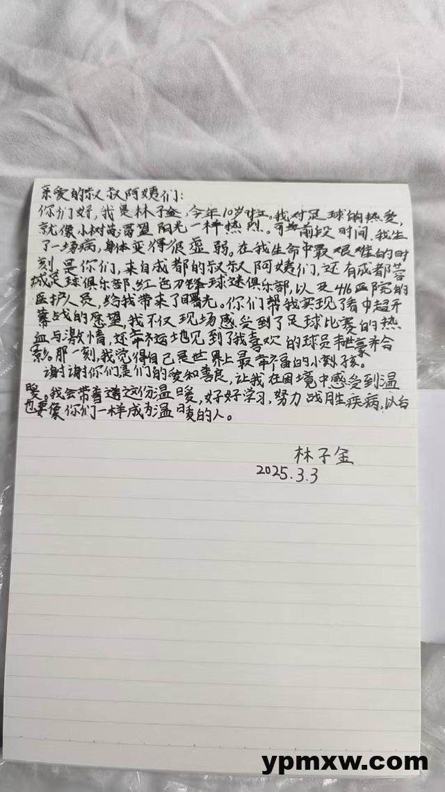 “谢谢你们,是你们的爱和善良,让我在困境中感受到温暖。我会带着这份温暖,好好学习,努力战胜疾病,以后也要像你们一样成为温暖的人。”林子金生前在给成都蓉城的一封感谢信中写道。